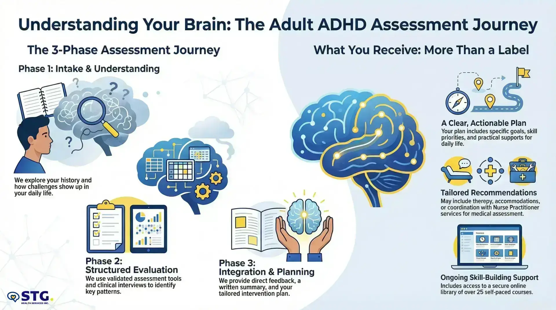 Access to the STG Online ClinicIn-depth intake and structured assessment to understand your insomnia pattern—what’s maintaining it, what’s getting in the way, and what the next steps should be.